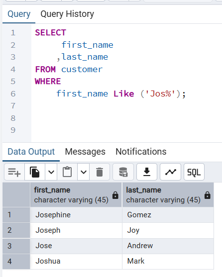 👉 Retrieves all customers whose first names starts with “Jo%” and whose first name contains three to five characters and to find this we use the BETWEEN operator. The advantage of using a BETWEEN operator is that it will return true if a value is found to be in the range of values specified and, in our case, it is between three to five characters.